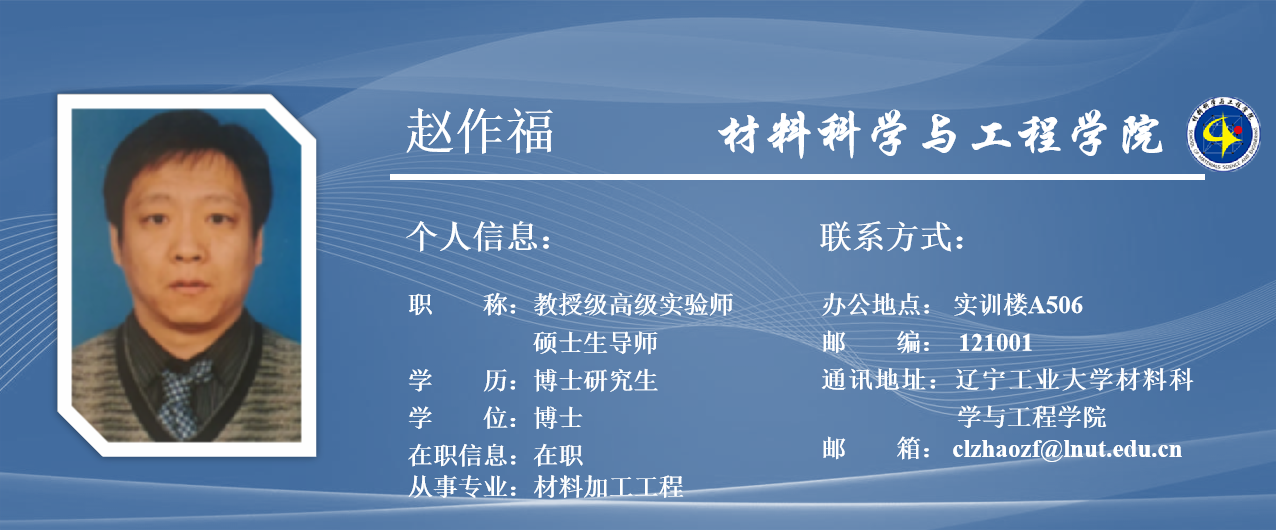 赵作福,男,1978 年生,辽宁锦州人,博士,教授级高级实验师,硕士生导师,辽宁省热处理学会理事,国家级期刊《新型工业化》特约编委,《Journal of Materials Research and Technology》等期刊审稿人。现任工程训练中心副主任。