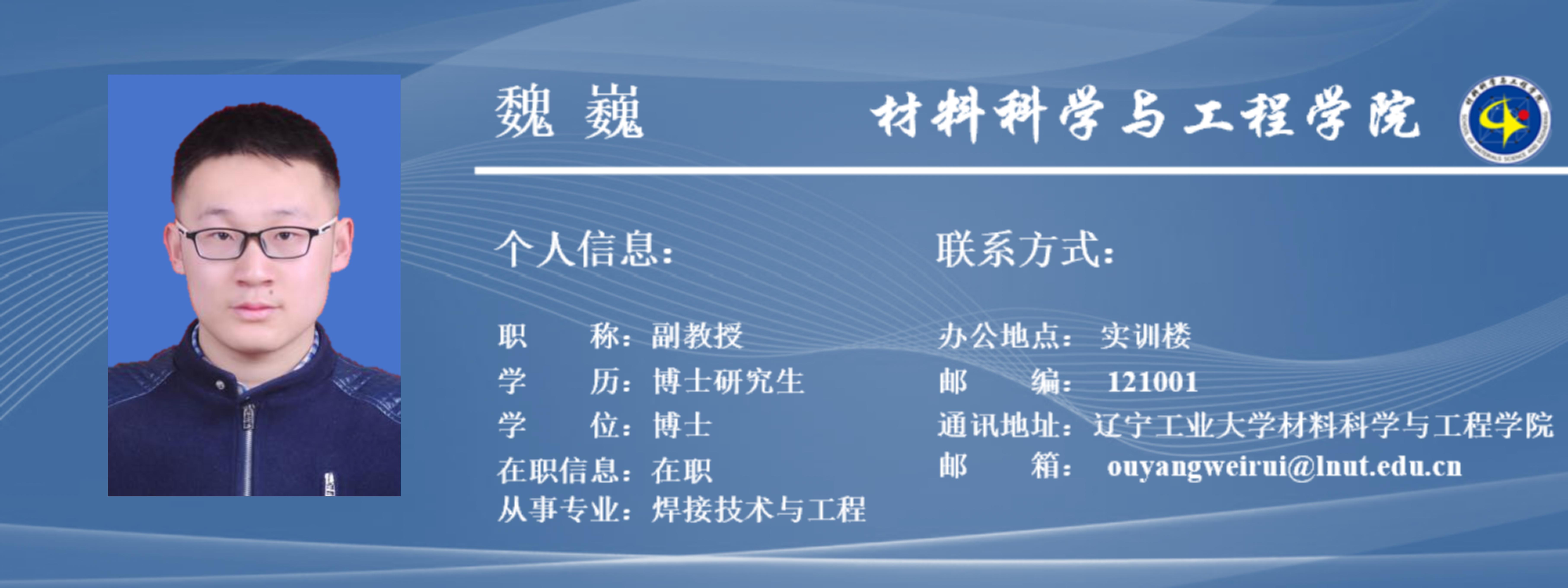 魏巍,男,1995年生,山西大同人,博士,副教授,硕士生导师,国际焊接工程师(IWE)。担任辽宁省焊接学会理事,中国机械工程学会高级会员(焊接分会),辽宁省轨道交通装备焊接与可靠性重点实验室固定成员,高熵合金焊接强韧化及疲劳机理课题组负责人。在IJMS、EFM、EJMA、MC、JMRT、Intermetallics等期刊发表了30余篇SCI、EI论文。其中,第一或通讯作者发表SCI论文13篇、EI论文4篇。累积IF>50,被引300余次,H因子为8。